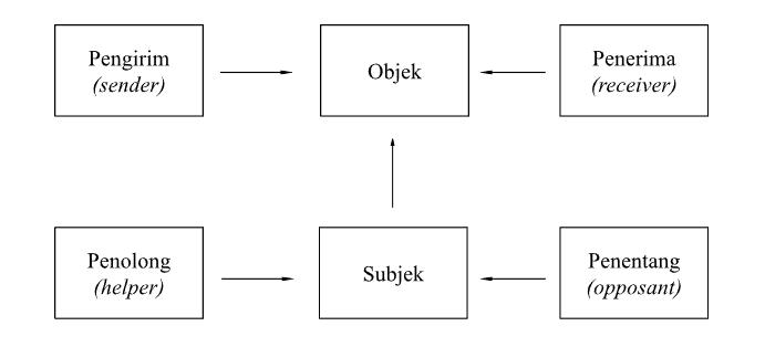 Greimas (dalam Salahuddin, 2018: 18) membagi enam aktan, yaitu subjek, objek, pengirim (sender), penerima (receiver), penolong (helper), dan penentang (opposant). Keenam aktan tersebut dapat digambarkan dalam bagan berikut.