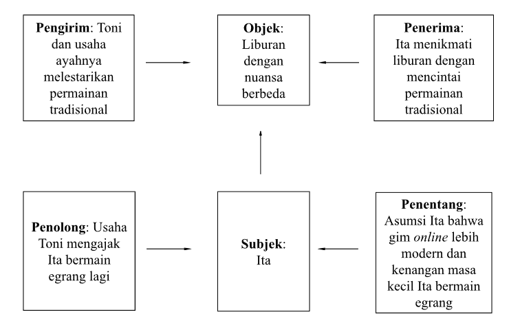 Berdasarkan skema aktan yang telah dijelaskan, cerita Mutiara yang Tersembunyi karya Nor Jannah yang dianalisis dengan pendekatan naratologi Greimas menggambarkan serangkaian struktur naratif yang mengisi keenam peran utama, yaitu subjek, objek, pengirim, penerima, penolong, dan penentang. Peran subjek diwakili oleh Ita yang memiliki keinginan untuk menjalani liburan semester dengan pengalaman baru. Dorongan untuk mencapai tujuan tersebut didorong oleh peran pengirim, yang termanifestasikan melalui usaha Toni dan upaya ayahnya untuk mempertahankan permainan tradisional. Melalui pengirim ini, subjek dapat memperoleh kesenangan dari liburan dengan menghargai tradisi lokal, atau menjadi penerima dalam alur cerita. Namun, dalam usahanya mencapai objek, subjek dihadapkan dengan penolong dalam bentuk usaha Toni untuk mengajaknya bermain egrang lagi, sementara pandangan Ita bahwa gim online lebih modern dan kenangan negatif dari masa lalunya bermain egrang bertindak sebagai penentang yang menghalangi dan menghambat subjek dalam mencapai tujuannya.