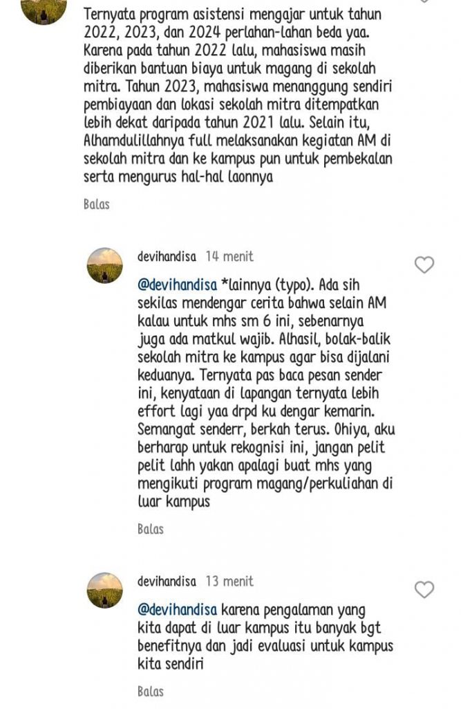 Dalam postingan tersebut, akun Instagram @devihandisa menyampaikan pendapatnya mengenai perubahan MBKM, khususnya program Asistensi Mengajar setiap tahunnya.