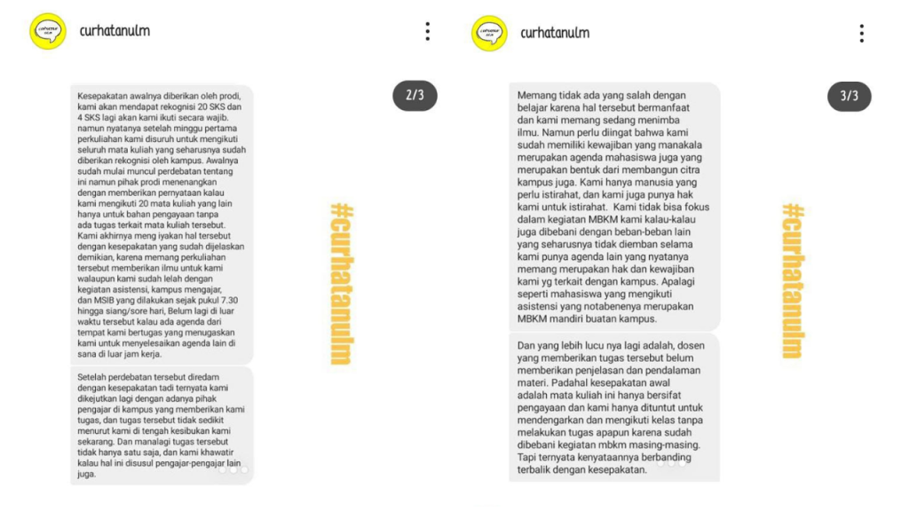 Kekecewaan tersebut menuai reaksi dan kritik dari mahasiswa ULM, yang mengungkapkan keberatan pengirim melalui platform media sosial. Salah satu kanal yang menjadi tempat mahasiswa berbagi kekhawatiran adalah akun Instagram @curhatanulm. Postingan tersebut mengemukakan bahwa Program Studi Guru Sekolah Dasar (PGSD) di Fakultas Keguruan dan Ilmu Pendidikan (FKIP) ULM menyetujui pemberian rekognisi sebanyak 20 SKS dan mengharuskan mahasiswa untuk mengikuti 4 SKS tambahan. Namun, setelah satu minggu pertama perkuliahan berlangsung, mahasiswa dikejutkan dengan keharusan mengikuti semua mata kuliah yang seharusnya sudah direkognisi sebelumnya.