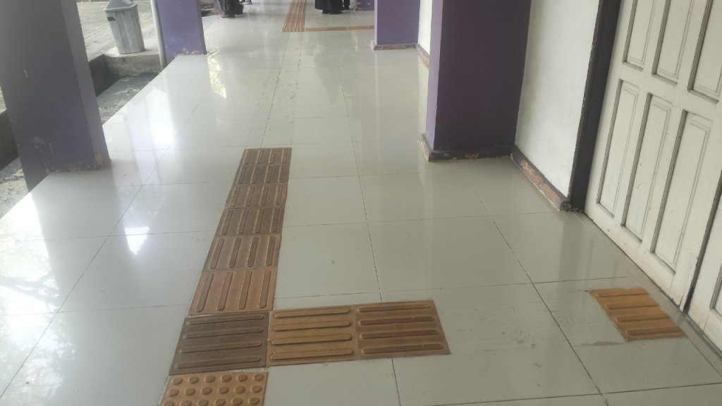 Jalur yang berfungsi sebagai penunjuk arah bagi mahasiswa disabilitas itu rusak di beberapa titik, sehingga menyulitkan pengguna dalam beraktivitas di kampus.