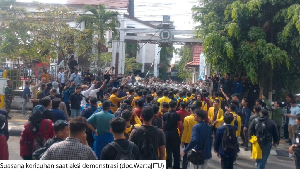 Berdasarkan pantauan tim redaksi Lembaga Pers Mahasiswa (LPM) Warta JITU, terlihat ada massa yang terluka akibat pukulan aparat.