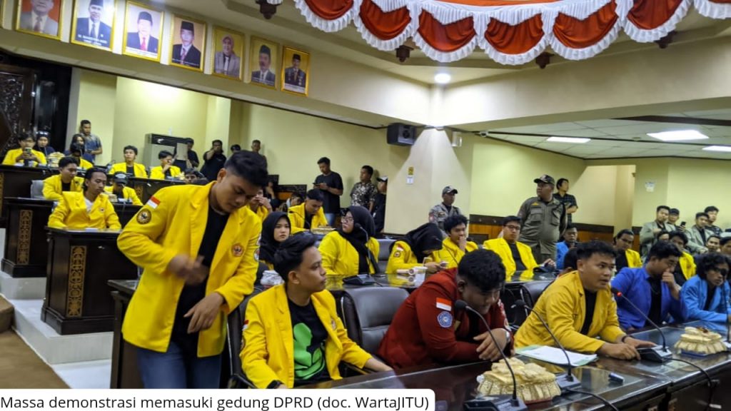 Berdasarkan pantauan tim redaksi Lembaga Pers Mahasiswa (LPM) Warta JITU, seluruh massa dari berbagai universitas terlihat berbaris mempersiapkan diri untuk masuk ke dalam gedung.